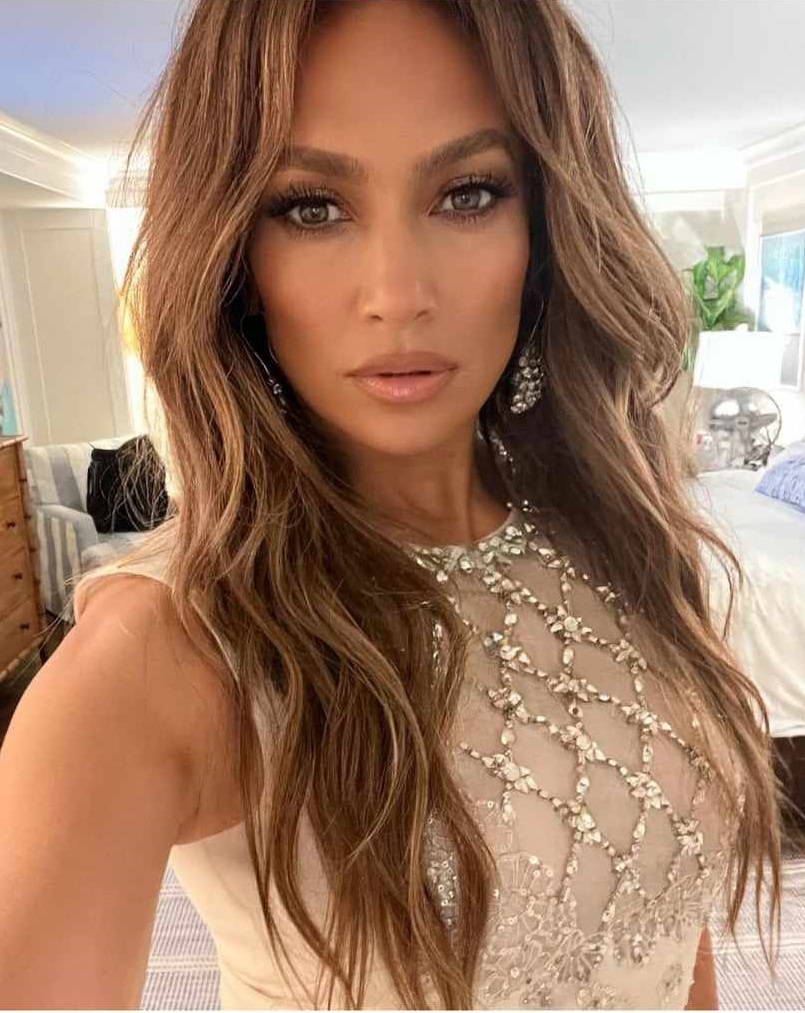 Дженифър остави косата си пусната на красиви вълни. Тя подчерта очите си с опушен грим, а на устните ѝ блестеше нюд червило с гланц.