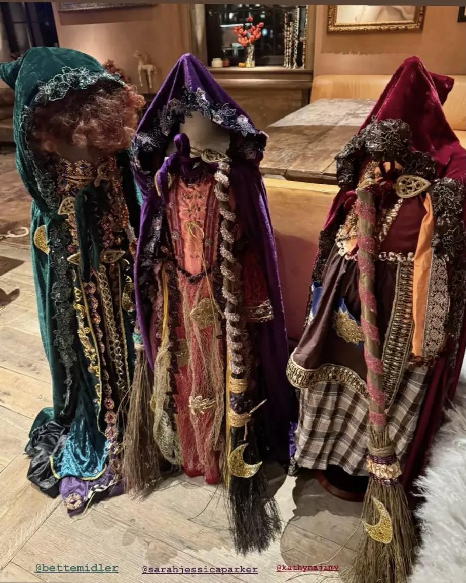 Всъщност става дума за вещерските тоалети от Hocus Pocus, които актрисата направи за дъщерите си Джеймс - на 9 години, Инес - на 7, и Бети - на 4. „Лесно е: взех готови наметала, след което набавих нужните детайли и аксесоари от друг магазин. После започна голямото шиене“, описа тя.
