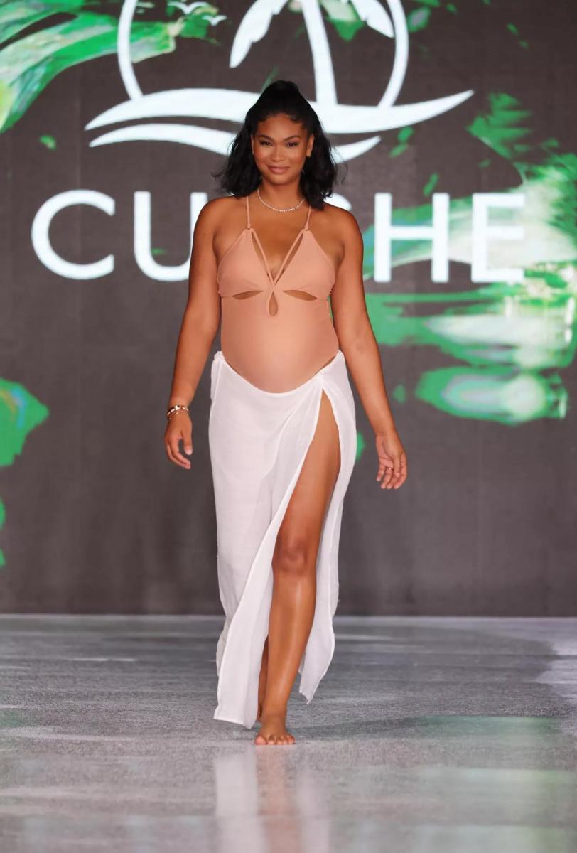 Само няколко седмици след обявяването на годежа им, 32-годишната бъдеща майка се качи на модния подиум във Флорида, за да участва в ревю на бански костюми и плажни облекла.