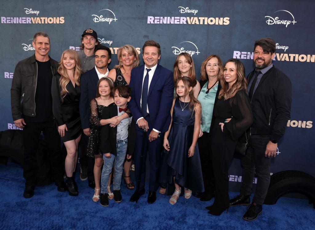 Джеръми Рънър с дъщеря си и колеги на една от първите си публични появи след инцидента.