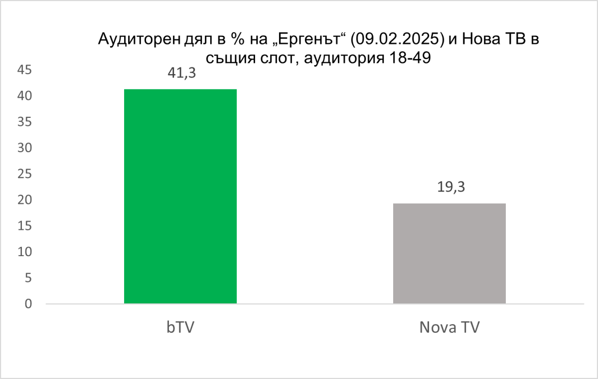 Стартът на приключението за Виктор Русинов и Мартин Николов, както и техните индивидуални бързи срещи с дамите бе проследен от 41,3% от аудиторията (18-49, GARB), което е 2 пъти повече спрямо втората телевизия в класацията в същия часови слот на 9-ти февруари. Премиерата на новия сезон на „Ергенът“ отбелязва рекорден аудиторен дял и зрителски интерес в първия епизод на формата и това е най-гледаният старт на риалити предаването от всичките му издания до момента.