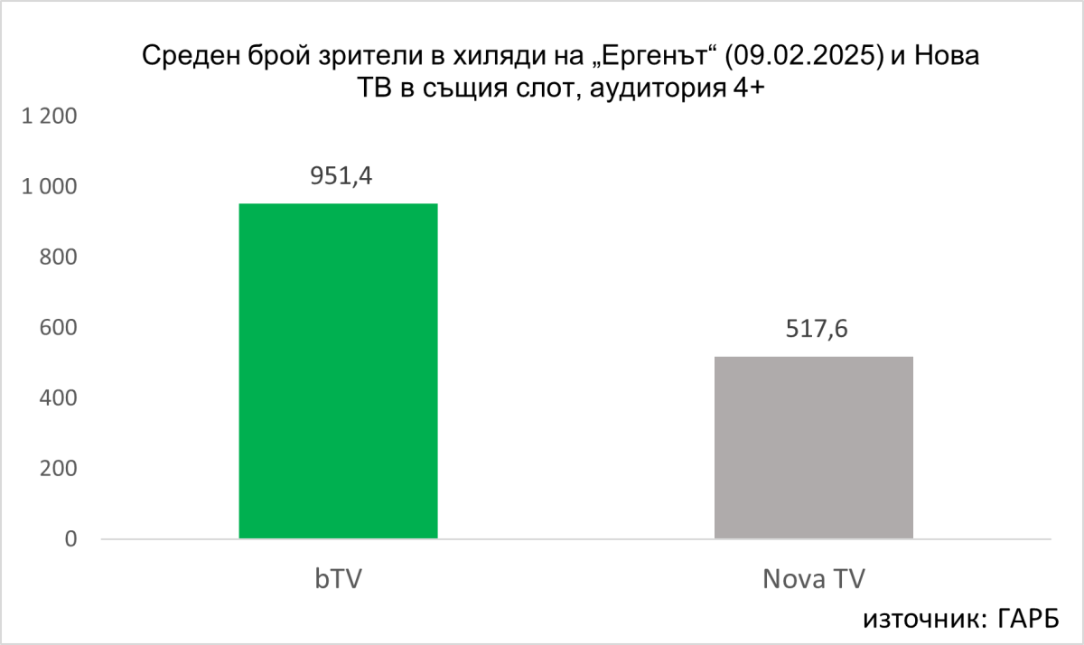„Ергенът“ за пореден път доказа, че е истински феномен в родния телевизионен ефир, който всички гледат и коментират. Премиерният епизод на романтичното риалити бе проследен от средно 951400 зрители в най-широката възрастова група, като в пиковите моменти достига до над 1 милион зрители (All, 4+, GARB) и е най-гледаното шоу предаване в неделната вечер.