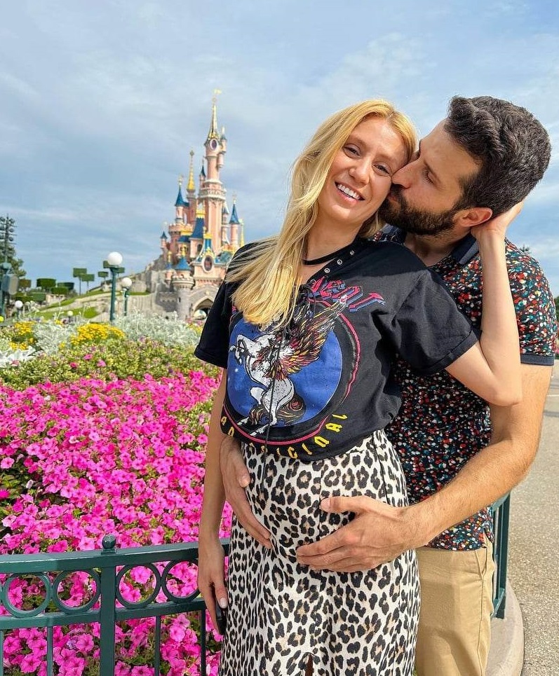 Съобщението за бъдещото попълнение в семейството дойде с кадър от "Дисниленд", на които виждаме как е прегърнал наедрялото коремче на приятелката си.