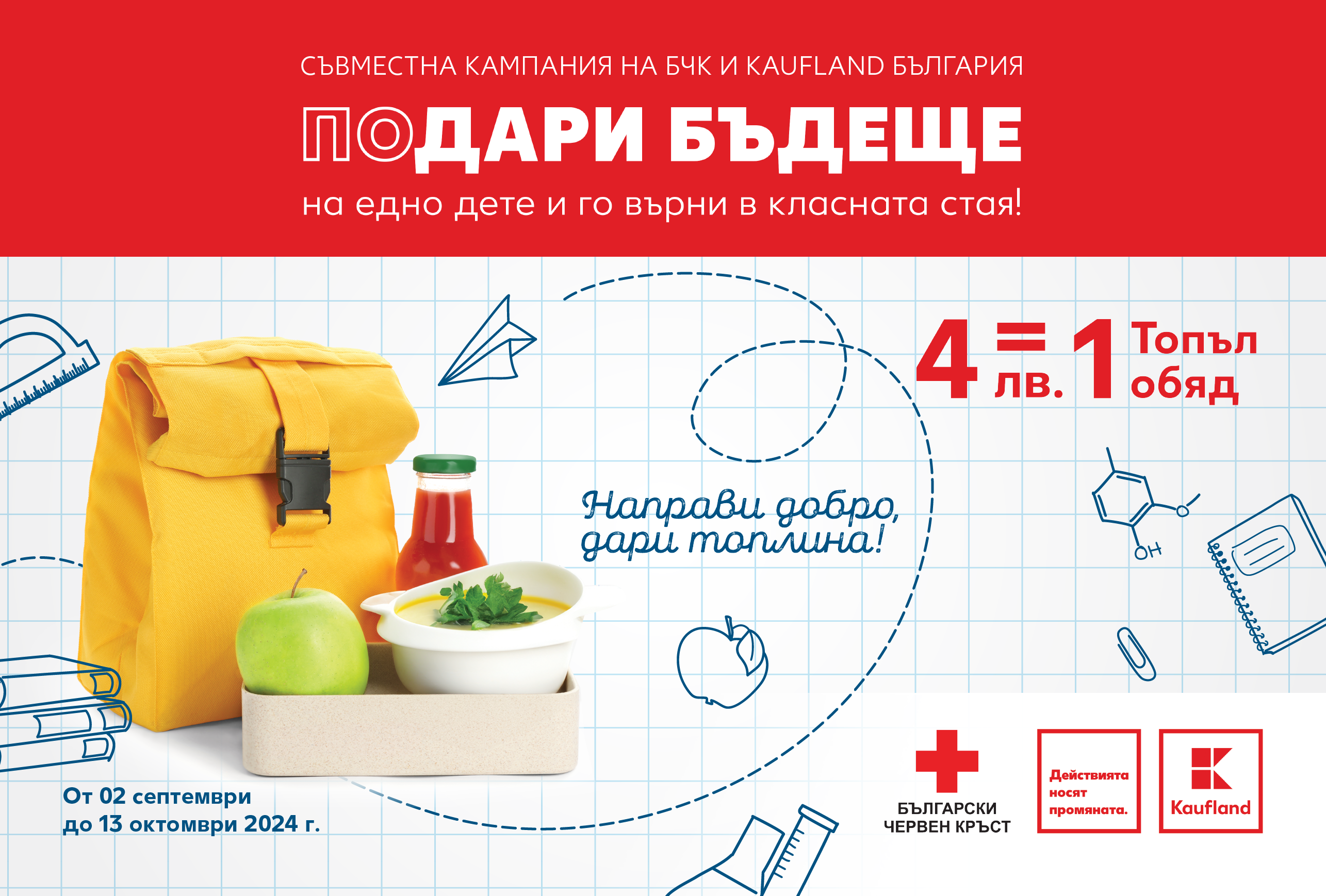 До 13 октомври клиентите на Kaufland България ще имат възможност да дарят средства за дете в нужда в дарителски кутии, разположени във всички хипермаркети на веригата в страната. Инициативата е част от традиционната дарителска програма „Топъл обяд“ на Българския червен кръст (БЧК), в която Kaufland България се включва за 15-а поредна година. Благодарение на кампанията се осигурява храна за ученици в неравностойно положение.