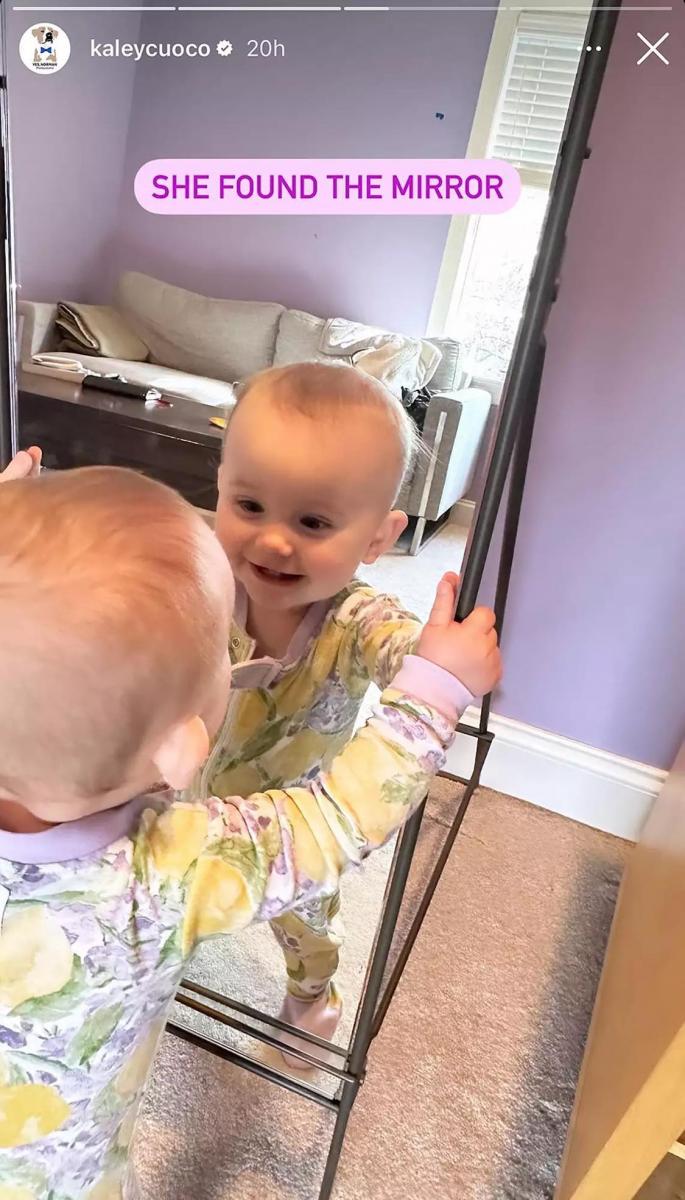 Кейли се пошегува с дъщеричката си в Instagram Stories, издавайки любимата игра на момиченцето. А именно: да се забавлява със своя образ в голямото им огледало у дома. Актрисата с намигане призна, че дъщеричката им определено е техен продукт, щом обича толкова да се оглежда.