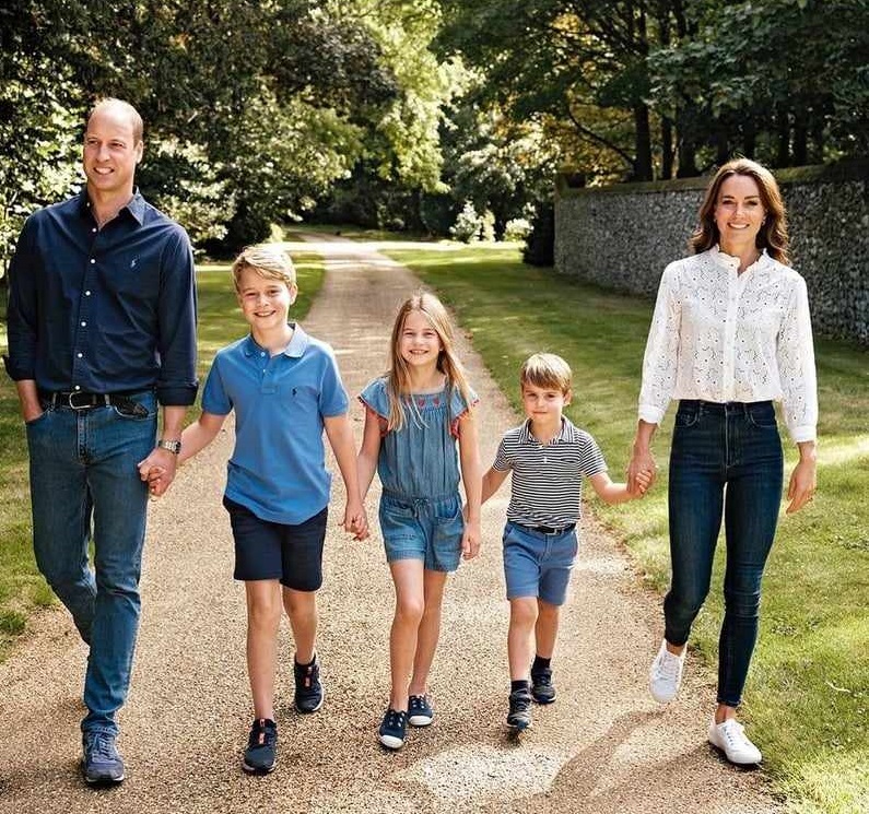 Снимката е направена в извънградския им дом Anmer Hoss в Норфолк и е първата им ваканционна картичка с принц Луи.