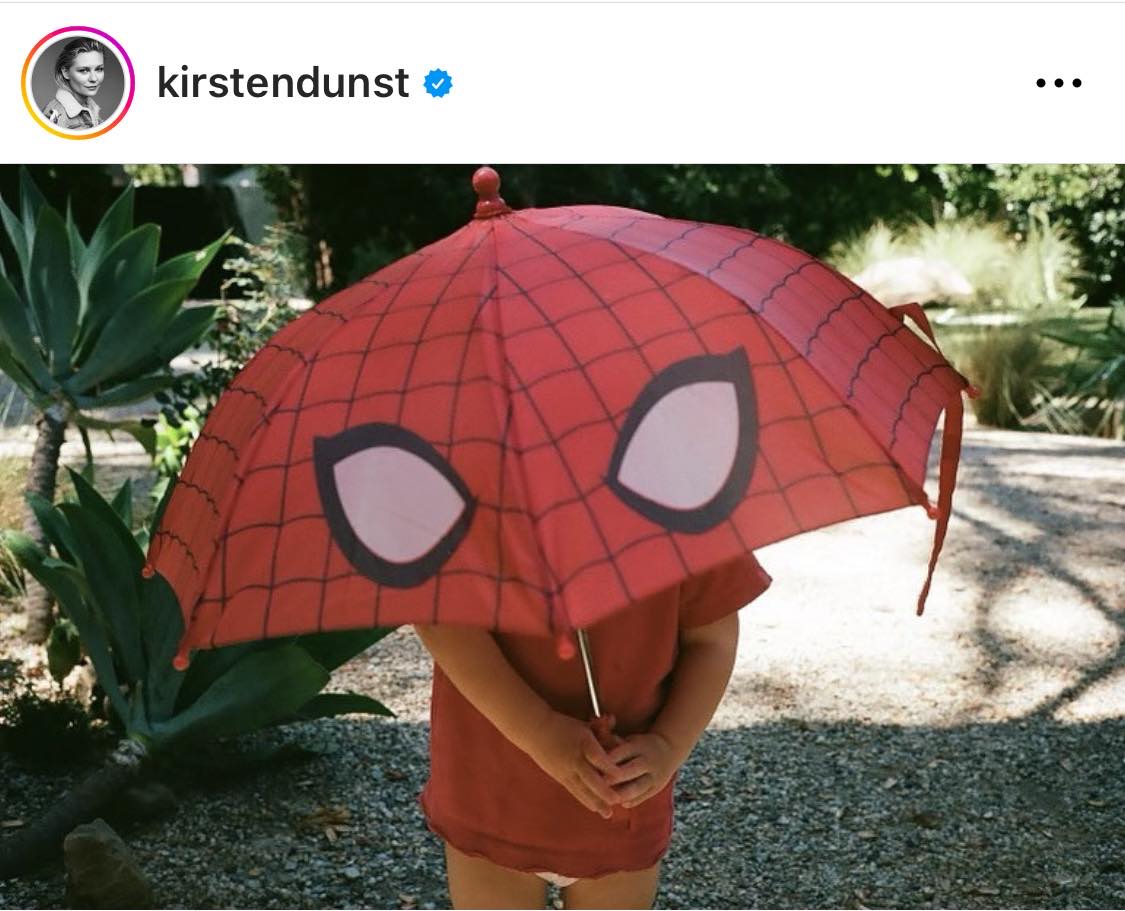 Кирстен Дънст сподели рядка снимка на 2-годишния си син Джеймс, който държи чадър с рисунки на Спайдърмен.