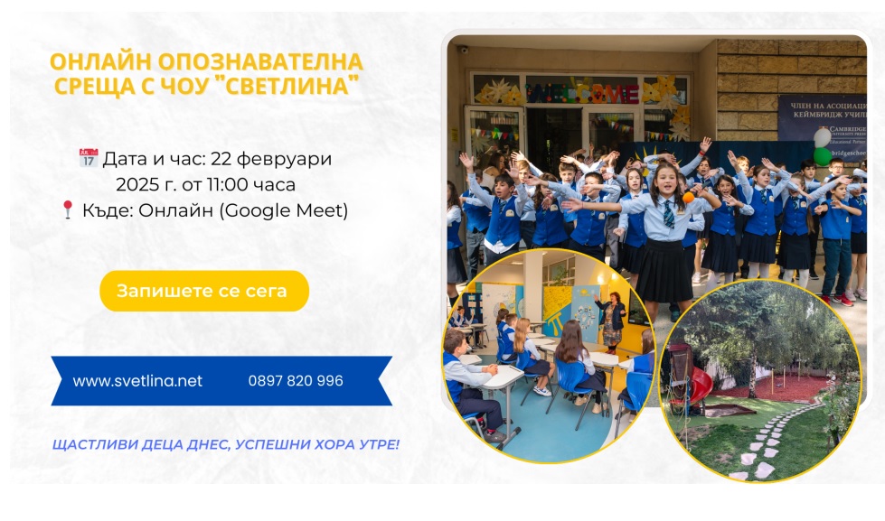 Заповядайте на онлайн опознавателна среща с ЧОУ „Светлина“, свързана с отворения прием за 2025/2026 г. На нея ще бъдат представени иновативните методи на учебното заведение и вдъхновяващата атмосфера, която помага на децата да учат и да се развиват.