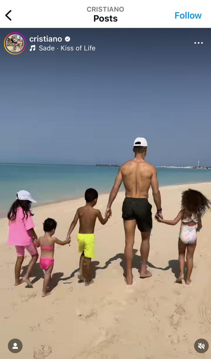 Кристиано Роналдо и децата му си прекарват чудесно заедно, особено ако са на плажа. 39-годишната футболна суперзвезда сподели видео в Instagram, на което показа как той и четири от децата му в бански костюми се разхождат ръка за ръка по слънчевата пясъчна ивица на Саудитска Арабия, докато на заден план звучи Kiss of Life на Sade.
