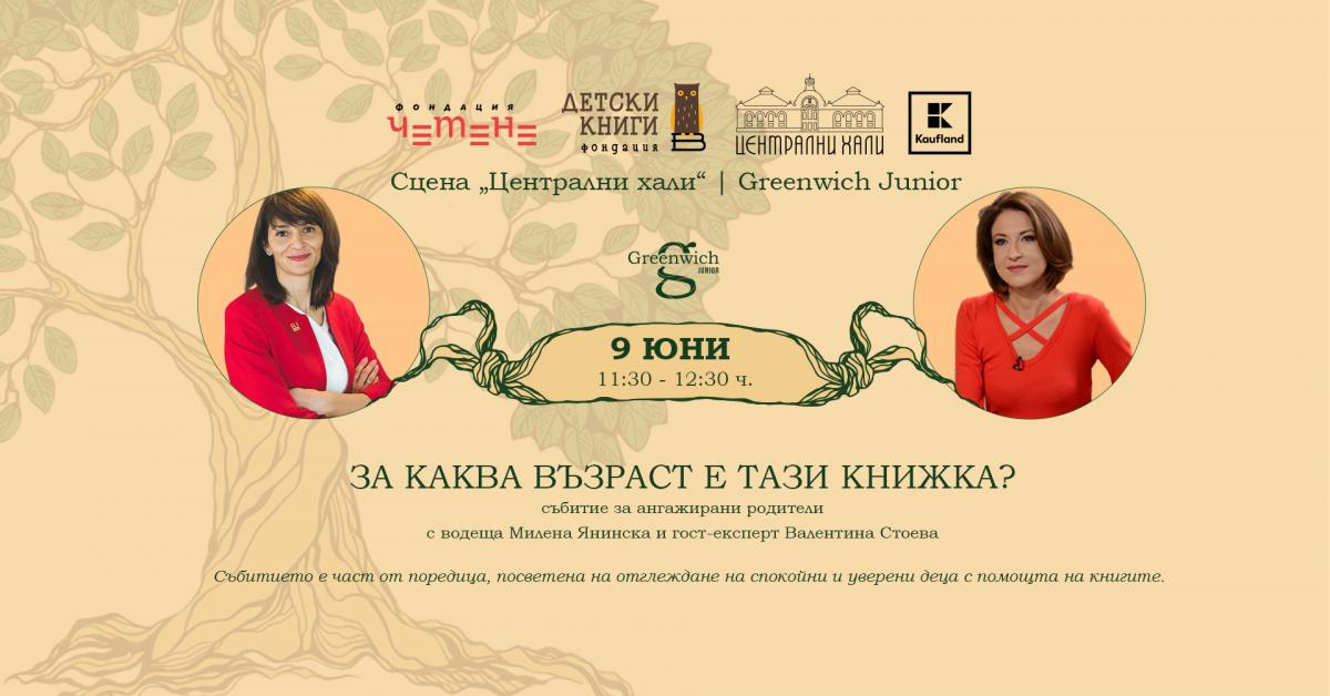 В неделя водещата на предаването по Нова телевизия „Социална мрежа“ Милена Янинска и специалистът по детско четене Валентина Стоева ще отговорят на важния за всички четящи деца и техните родители въпрос „За каква възраст е тази книжка?“. Всички, които искат да разберат повече за детското четене, книгите и всички важни аргументи при избора на заглавие, могат да се включат на 9 юни (неделя) 2024 г. от 11:30 ч. на „Сцена Централни хали“. Образователното събитие се организира в партньорство с най-голямата детска книжарница в България Greenwich Junior, които обещават много интересни събития всяка неделя до края на юни.