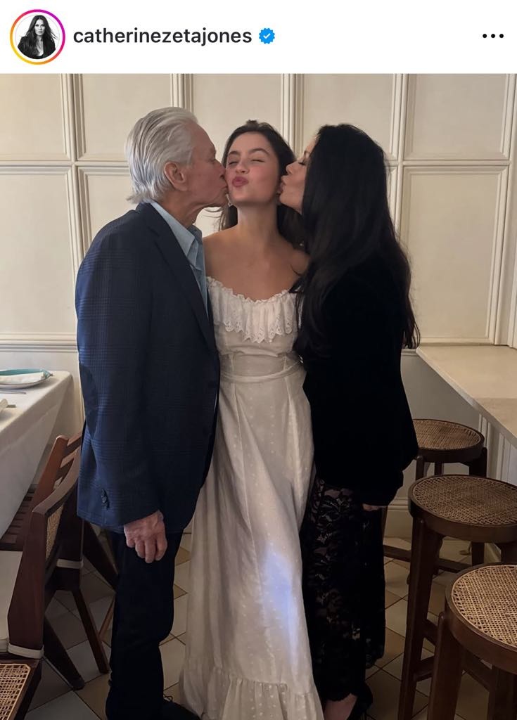 Актрисата сподели снимка, на която тя и Дъглас целуват 22-годишната Карис, за да отбележат завършването ѝ