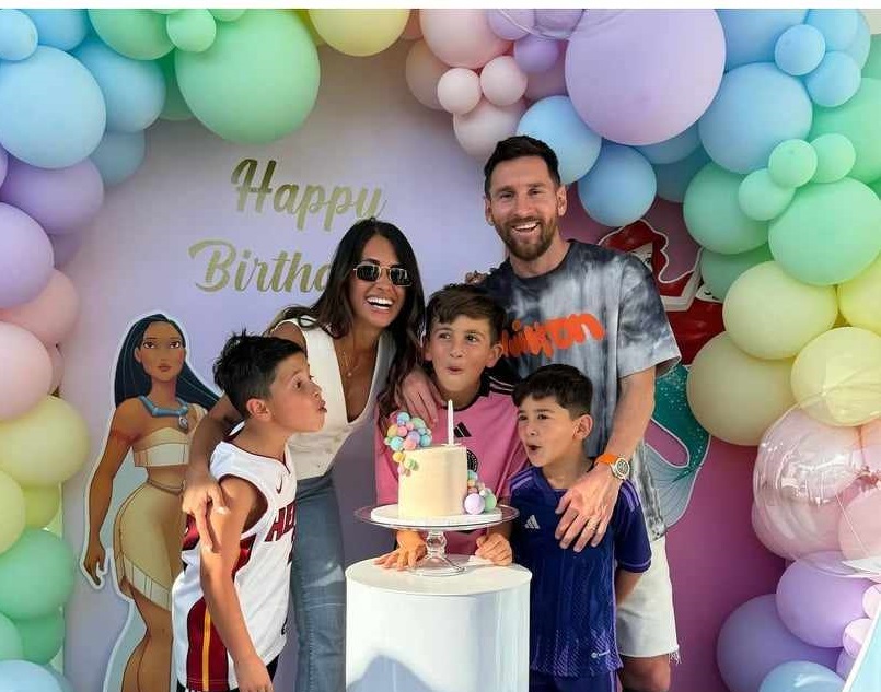 Меси, Антонела Рокуцо и трите им деца пред празничната торта. Снимка: Instagram