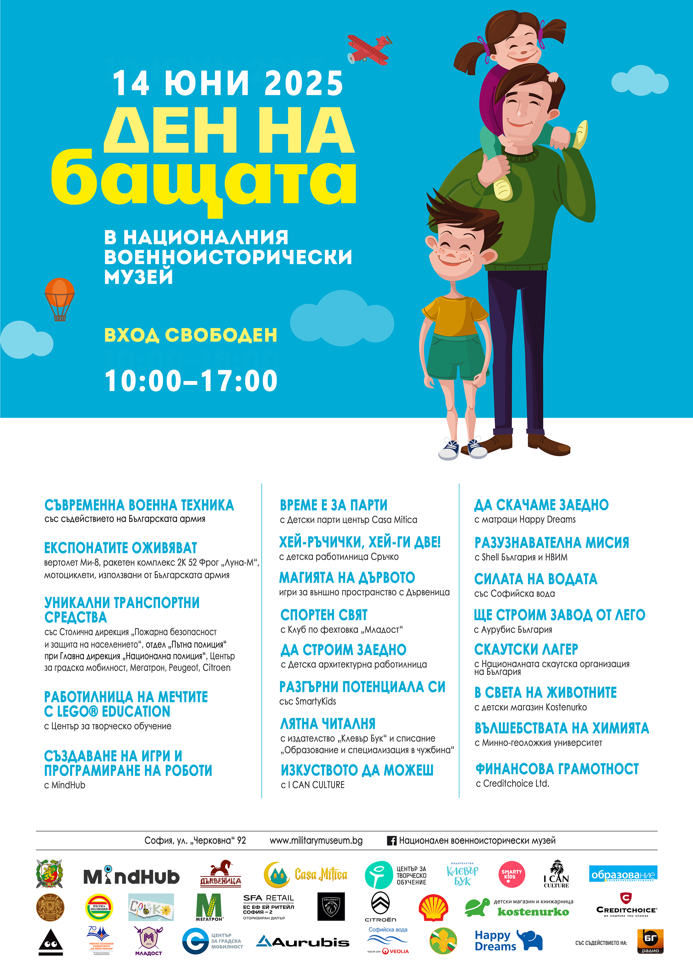 На 14 юни (събота) от 10.00 до 17.00 часа с вход свободен, много атракции, игри и изненади ще се проведе най-големият детски празник в Националния военноисторически музей (НВИМ) – Деня на бащата, посветен на специалната връзка между бащите и децата. В този ден в Музея всичко е безплатно, забавленията дебнат отвсякъде, а освен татковците, майките също са добре дошли.