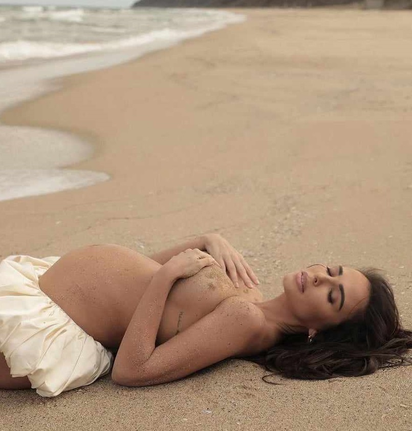 Тя лежи на морския бряг, а заоблиният й корем издава, че най-вероятно е в 6-7 месец.