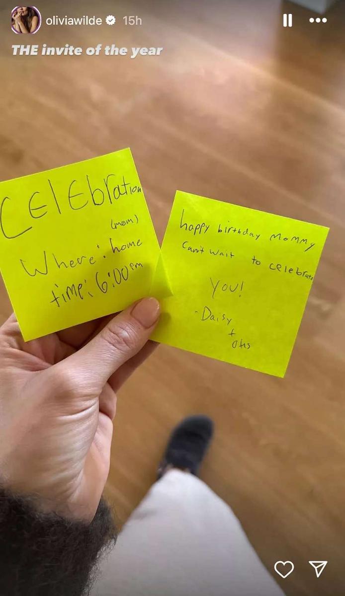 Оливия Уайлд получи поканата на живота си и тя е за парти в собствения ѝ двор. 41-годишната актриса сподели снимка в Instagram Stories на поканата, която е получила от 8-годишната си дъщеря Дейзи и 10-годишния си син Отис. На снимката Уайлд държи две жълти лепящи се бележки. Едната гласи: „Празнуване (мама). Къде: Време у дома: 18:00“, а на другата децата бяха изписали: „Честит рожден ден, мамо! Нямаме търпение да празнуваме! Дейзи + Отис“.