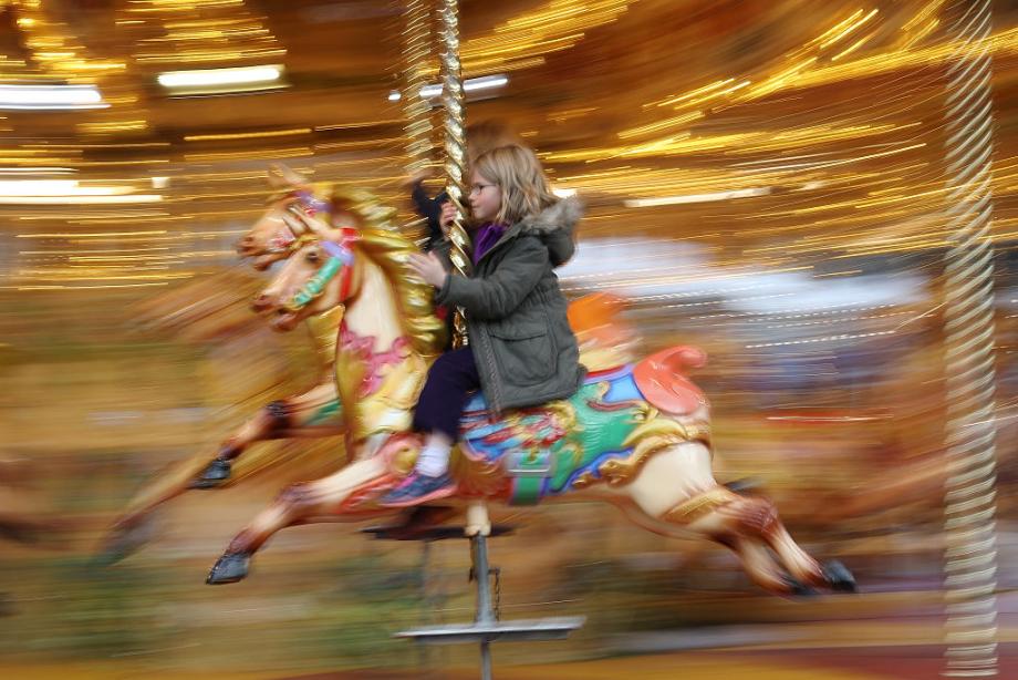 Момиченце се радва на въртележката пред Природонаучния музей в Лондон на 4 януари 2017 г.