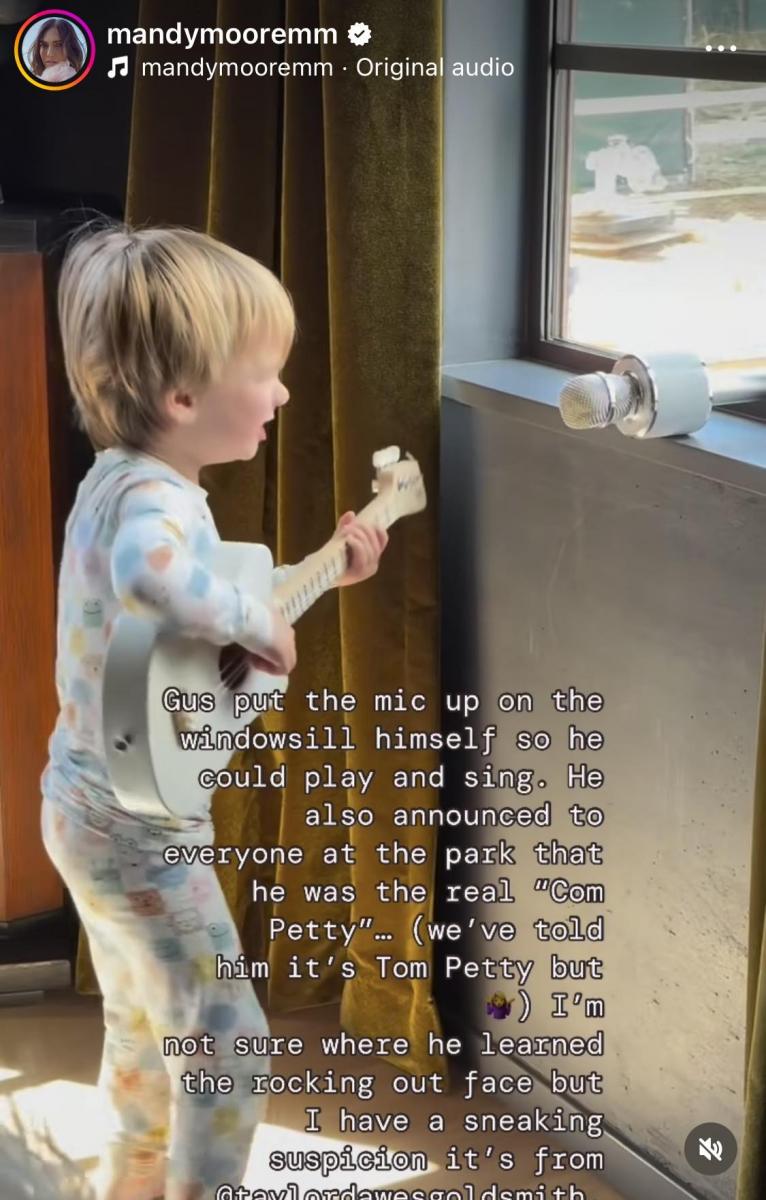 Манди Мур отглежда бъдеща рок звезда. Наскоро отново бременната актриса, сподели сладък видеоклип в своя Instagram Reels, на който 3-годишният ѝ син Огъст „Гюс“ Харисън, опитва да подражава на татко си Тейлър Голдсмит като „свири“ на китара и пее на микрофон, облечен в сладка пижама.