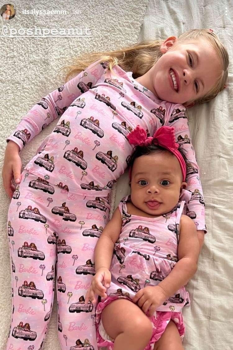 29-годишният модел сподели очарователна снимка в своя Instagram Story на дъщерите си Хейло Мари, на 5 месеца, и Зийла, на 5 години, и двете облечени в еднакви розови пижами с десен на Барби.
