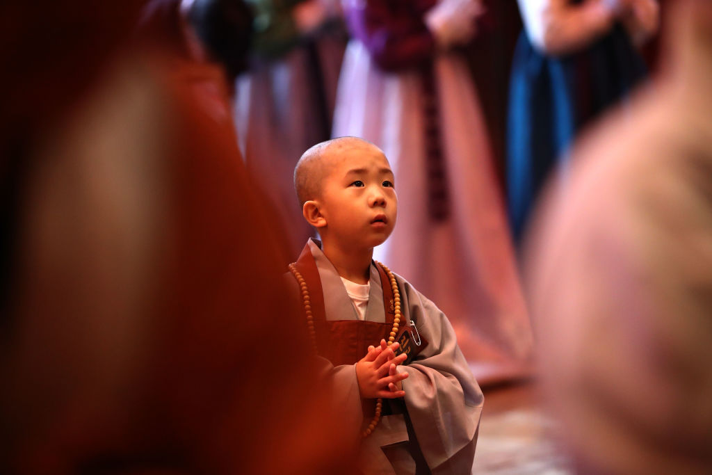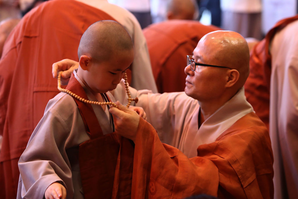 Момчета на церемония по встъпването им като будистки монаси по време на годишнината от рождението на Буда в храма Чоги на 2 май 2018 г. в Сеул, Южна Корея. По време на церемонията косите на децата се подстригват от по-възрастните монаси.
