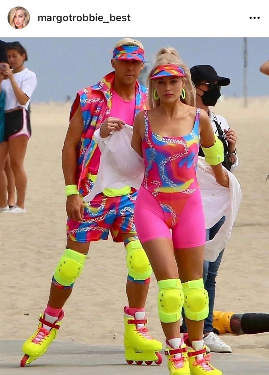 Номинираната за „Оскар“ актриса била видяна също така да се разхожда на снимачната площадка с голяма розова кутия с розови донати и островърха парти шапка в същия цвят. Тя не се поколебала да покара и ролери в компанията на Райън Гослинг, който играе Кен във филма.