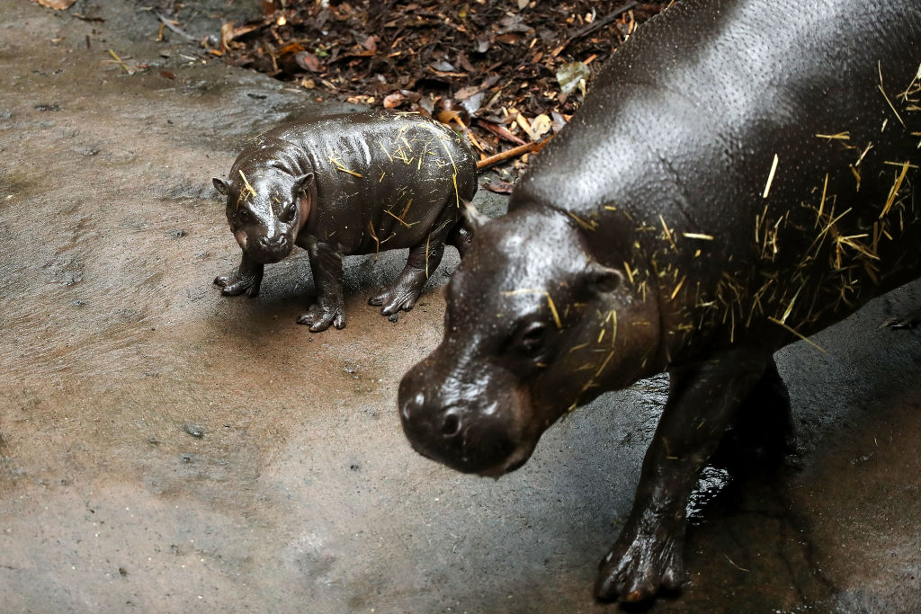 Хипопотамчето джудже, което още си няма имe, прави първата си разходка с майка си Камбири в зоологическата градина "Таронга" на 17 март 2017 в Сидни, Австралия. То е родено на 21 февруари тази година и е първото от вида си, дошло на бял свят в такива условия, от 2010 г. насам. От вида хипопотами джуджета в света са останали едва 3000 екземпляра и са обявени за изчезващи. За разлика от по-големите си събратя, хипопотамите джудже стигат едва 85 см на височина и близо 3 м на дължина.