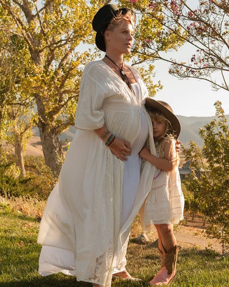 На фотоса Пинк е придружена от 5-годишната си дъщеричка, която прегръща бременния ѝ корем.