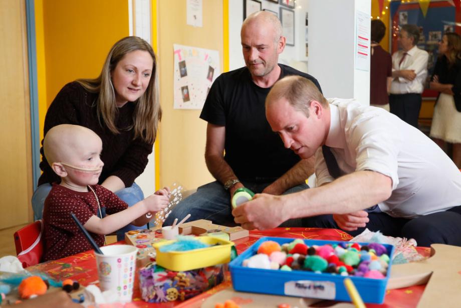 Принц Уилям, херцог на Кембридж, разговаря с дете по време на визитата му в болницата Royal Marsden в Сатън. Херцогът е президент на фондацията към болницата. Той се включва в ежедневието и наблюдава грижите, които се полагат за децата.