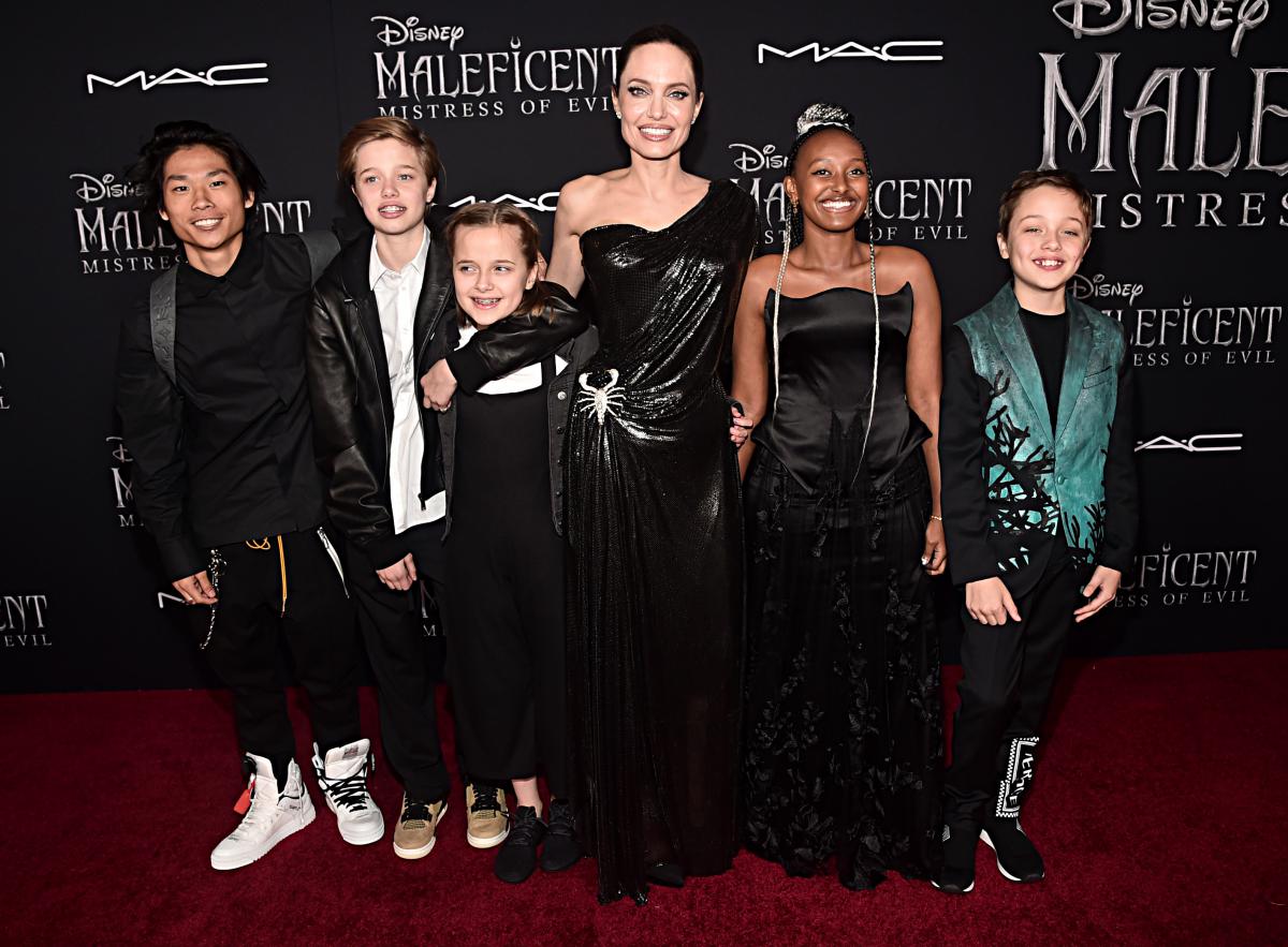 В стилистиката на емблематичния си образ и в компанията и на децата си, Джоли се появи с впечатляващата черна кожена рокля, която носеше и на премиерата на първия филм през 2014 година.