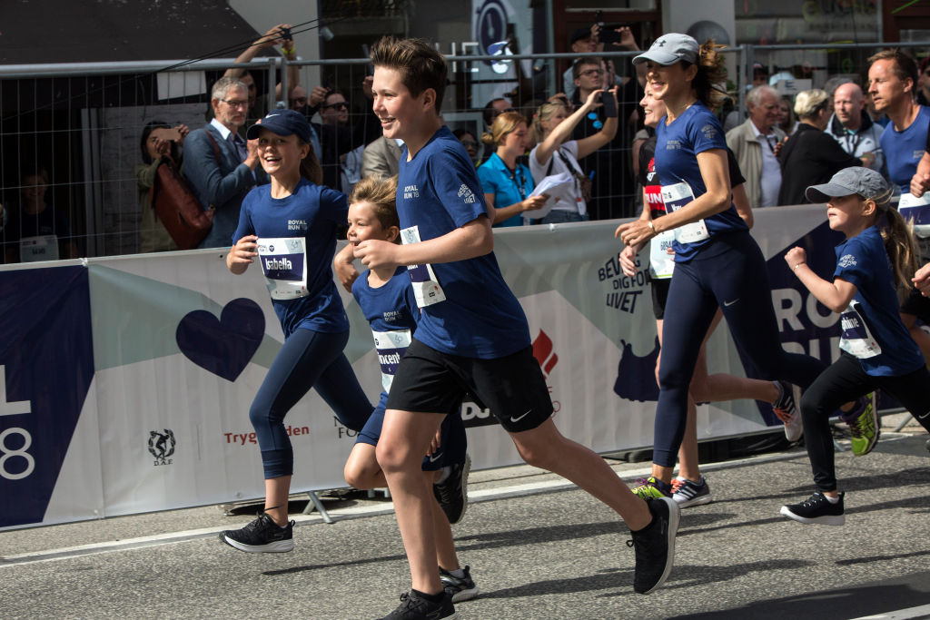 Кралските деца принц Кристиян и принцеса Изабела, следвани от принцеса Жозефин и принц Винсънт и тяхната майка тичат в кралската обиколка по случай 50-ия рожден ден на принц Фредерик през 2018 г. в Копенхаген, Дания. Снимка: Guliver / Getty Images