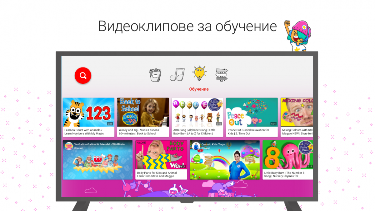- Канали и плейлисти могат да се разглеждат в четири различни категории: Обучение, Поредици, Разглеждане, Музика. Децата ще открият там видеоклипове, които ще ги накарат да се смеят или да проявят интерес. Те ще се научат как да правят пеещи балони, как да рисуват, да броят или да слушат известни български детски песнички.