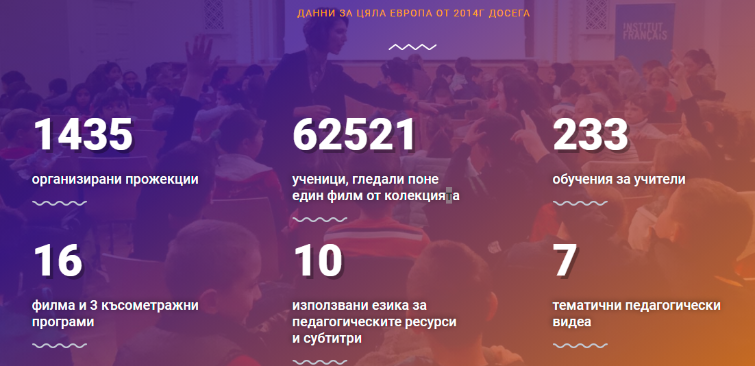 „През последните години инициативата „Кино в училище“ се разрастна и като общност, и като възможности за учители и ученици – разказва Ралица Асенова – инициатор на програмата. Много ценен помощник е платформата CinEd, която предлага колекция от европейски филми на различни езици и педагогически материали към тях. През 2020-та въпреки пандемията, близо 700 ученици са гледали поне един европейски филми от платформата на CinEd или са участвали в практическо ателие. Над 200 учители пък са взели участие в обученията, които се проведоха онлайн и присъствено. А общо за 6-те години, откакто работим по този проект, броят на учениците, взели участие в програмата, е близо 10 000, а на учителите 500“ – съобщава цифрите Ралица.