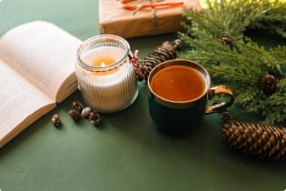 Книга, борови клонки, чаша кафе и свещ . Снимка: Shutterstock