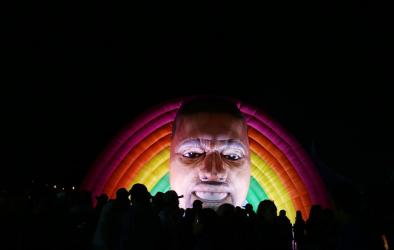 На сцената, пред надуваемата фигура на Кание Уест