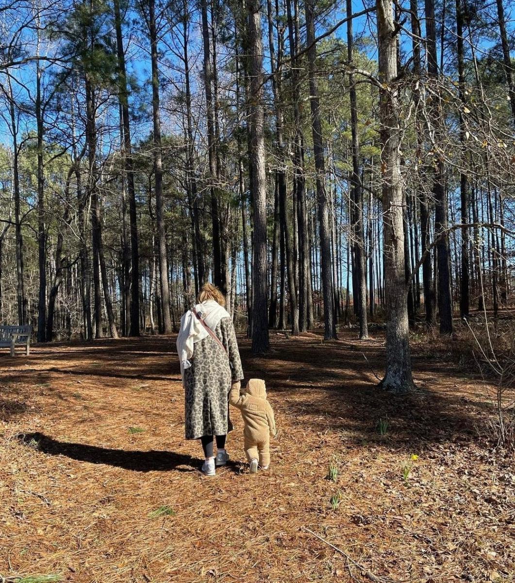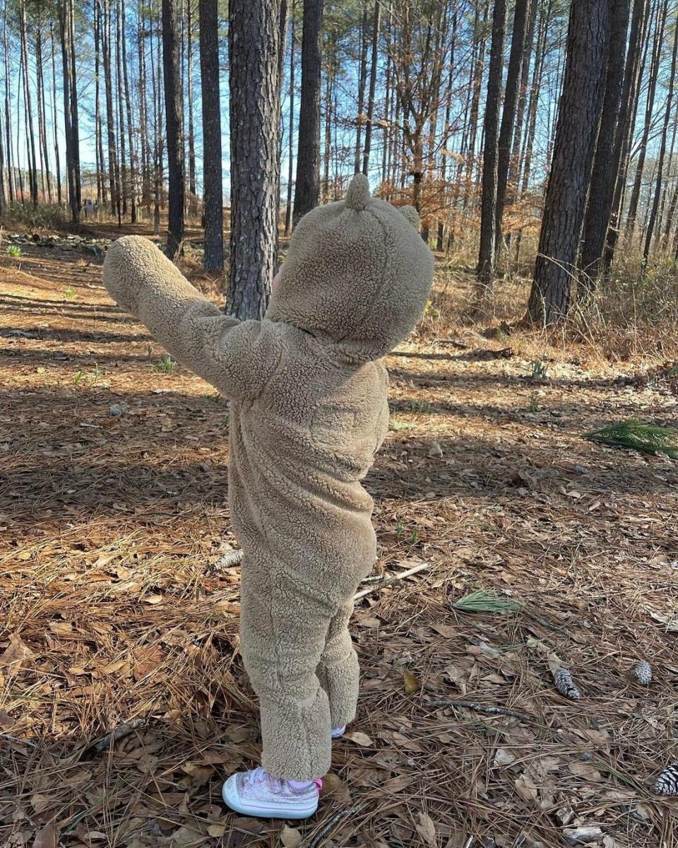 „Моето малко сладко плюшено мече. Ние изследваме природата!,“ написа под снимките Катрин.