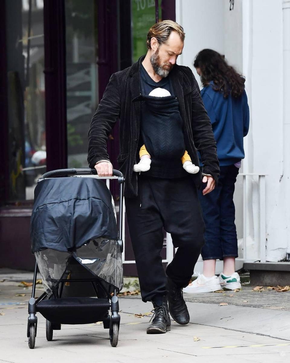 Секссимволът на британското кино Джъд Лоу бе засечен из улиците на Лондон препасан със слинг, как за първи път разхожда бебето си.