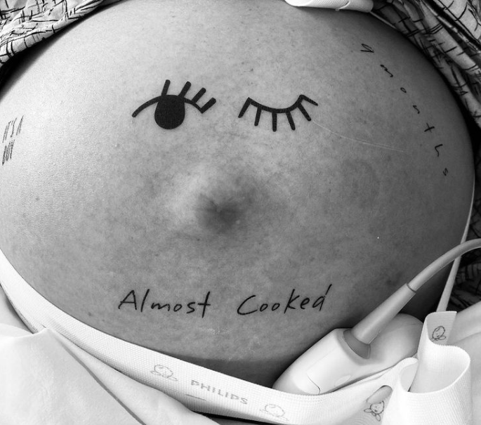 Тя публикува снимка на корема си, на която големите ѝ деца изписаха няколко думи: „Момче“, „Почти готово“, „9 месеца“.