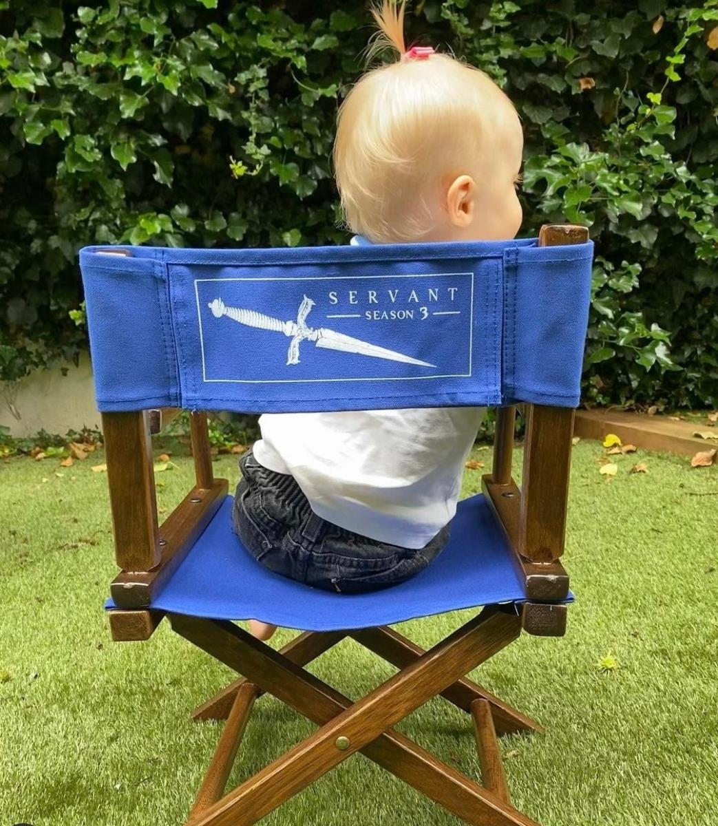 Уенздей седи на стол с надпис „Servant” season 3 “- името на шоуто, в което баща ѝ участва. Премиерата на третия сезон бе вчера.