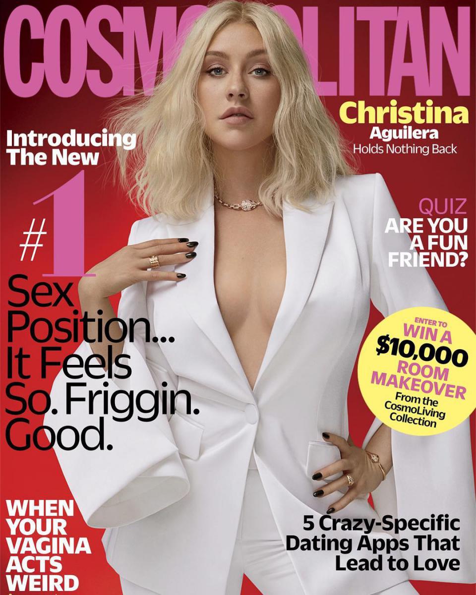 Агилера позира в бял костюм с панталон и сако, под което няма блуза, а и боди не се вижда.