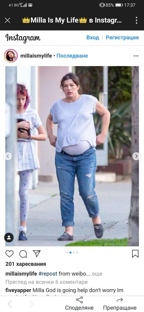Фен профил на актрисата публикува снимки от разходка в Ел Ей със съпруга й Пол Андерсън и голямата им дъщеря Евър.  От кадрите се виждат всички екстри на бременността – украинката, която някога бе сред най-високо платените модели в света, е с отекли крака и с поне 30 кг по-пищна фигура.