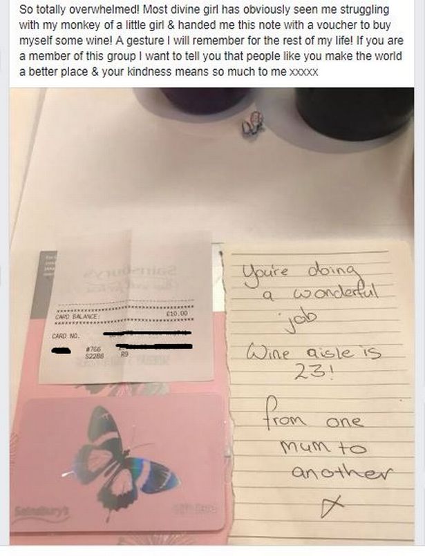 Според думите й, Лангър влязла в супермаркета с малката си дъщеря, за да си напазарува. В някакъв момент й предали бележка и ваучер на стойност 10 лири. Посланието гласяло следното: „Справяш се страхотно! Виното е на 23-ия щанд. От една майка на друга. Целувки.“ На историята реагират редица медии на острова, сред които и birminghammail.co.uk.