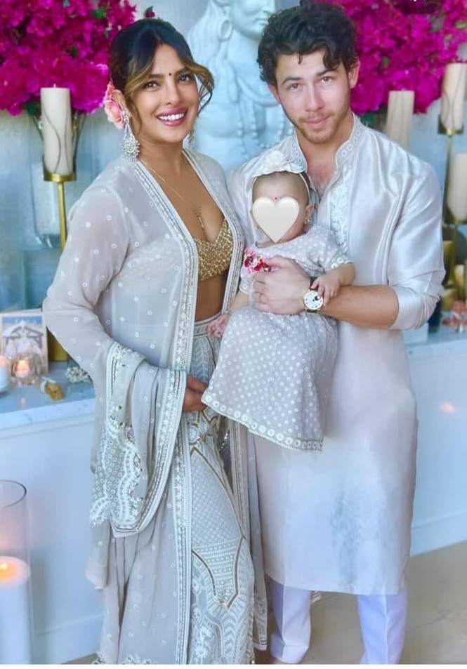 Приянка носеше в бяло бродирано сари, Джо - панталон и риза в същия цвят, а дъщеря им бяла рокличка.
