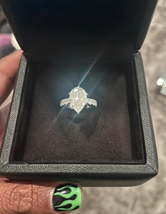 На нея се вижда ръката на 36-годишния ѝ приятел Александър Едуардс, който държи кутия с масивен диамантен пръстен. Той много прилича на годежен.