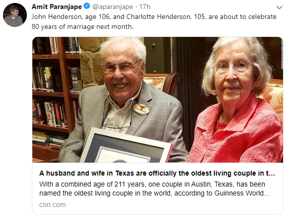 Джон Хендерсън е на 106 години, а съпругата му Шарлот на 105, което прави общата им възраст 211 г. На 15 декември двамата ще отпразнуват 80 години брак, или т. нар. дъбова сватба.
