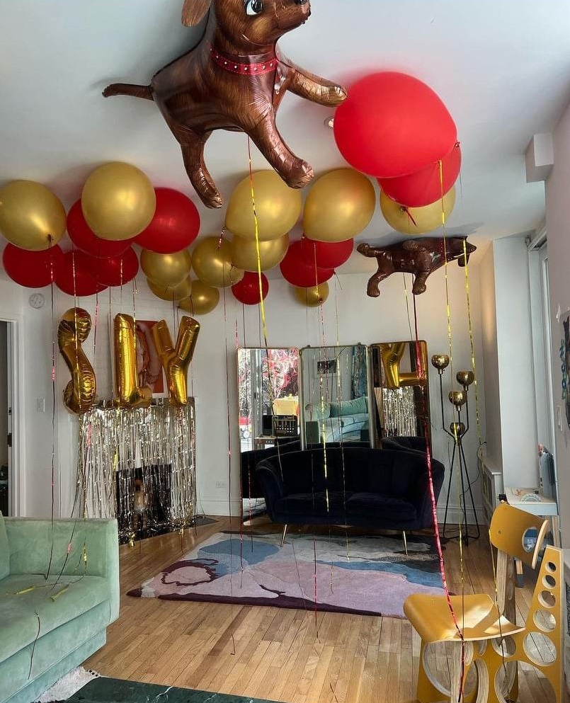 За да зарадва сина си, Емили украси стаята със златни и червени балони, сред които летяха и „балони-кучета“ с надпис Слай ( на кратко от Силвестър).