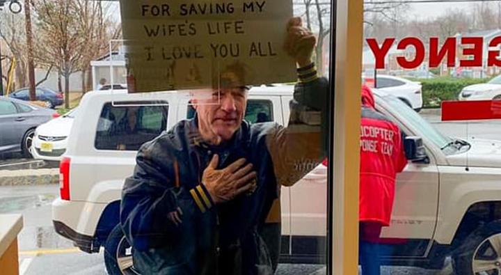 На Мористаун Медикъл Сентър с табела в ръце, на която пишело: „Благодаря на всички хора в спешното, задето спасихте живота на съпругата ми! Обичам всички ви!".