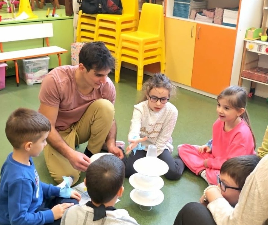А Калин показва игра на чинии и чаши. Нещо, което е приковало вниманието на всички деца, насядали около него.