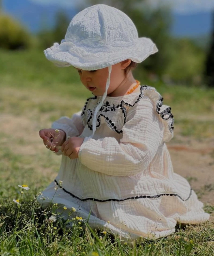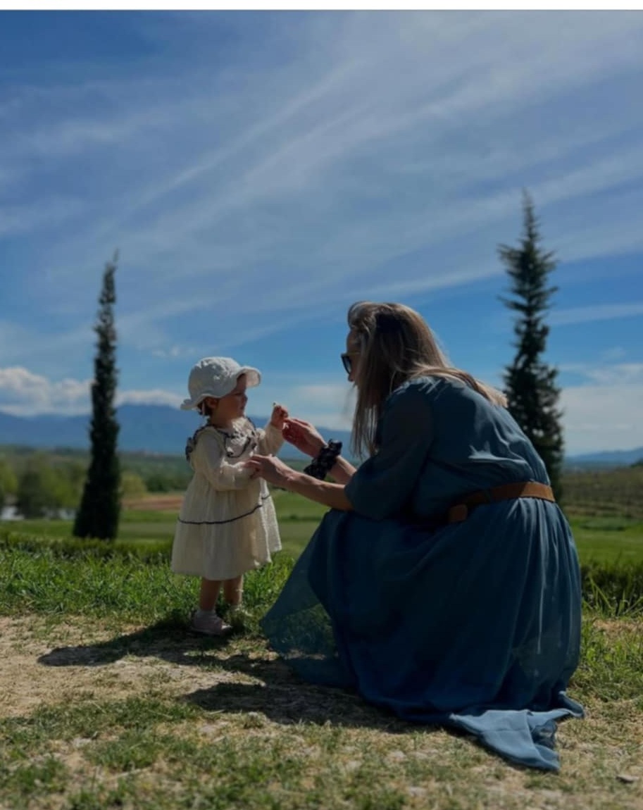На кадрите виждаме малката Ема с елегантен тоалет – бяла рокличка с орнаменти и шапка с периферия как бере цветя на поляната, показва ги на майка си и двете обсъждат нещо.