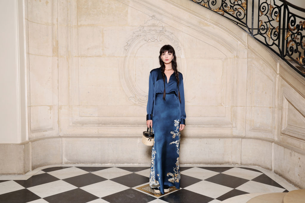 За светско излизане моделът избра комплект от син сатен: феерична блуза и пола с щампа на златни цветя — всички, разбира се, Dior.