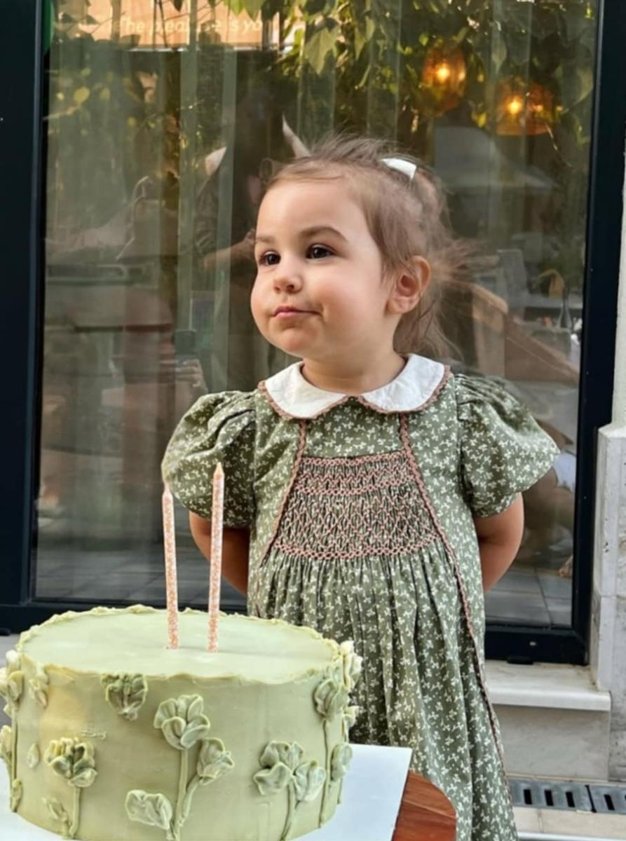 На кадрите се вижда как малката Елизабет, облечена в зелена рокля с орнаменти и с бяла якичка, духа свещите на торта, която е в същия цвят като роклята на рожданичката.