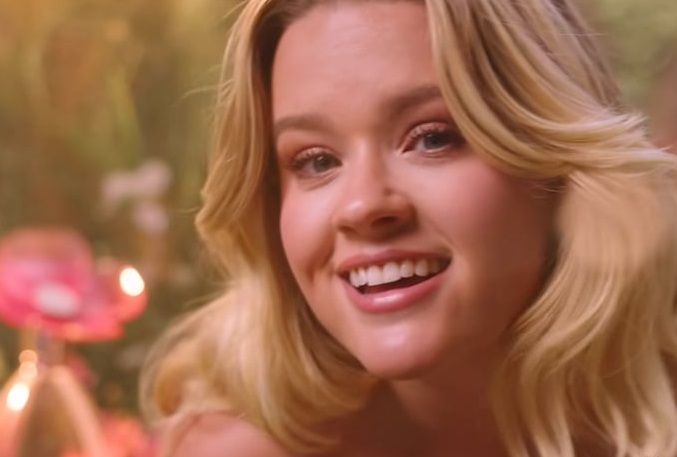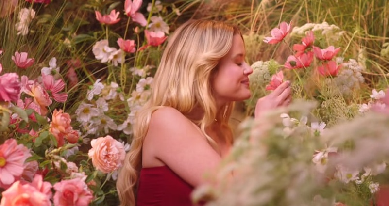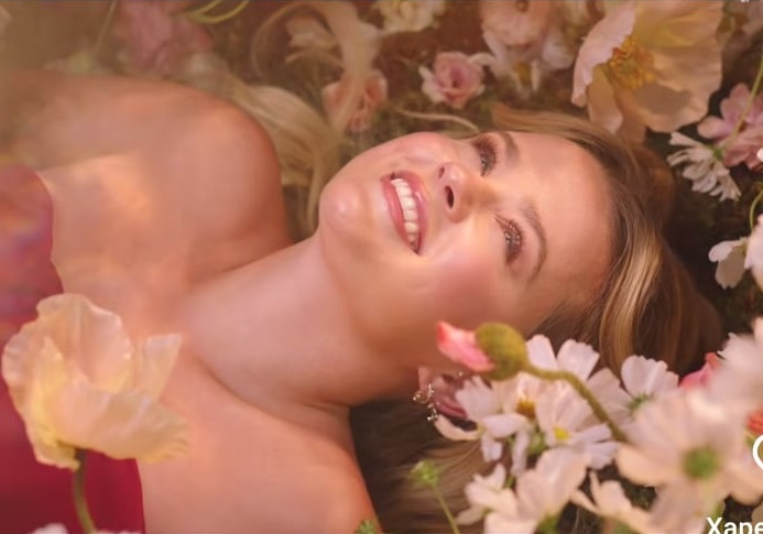 На кадрите в рекламния клип тя е заобиколена от нежни цветя, гледа замечтано в камерата и много грациозно пръска от шишето, за да събуди интереса на публиката.